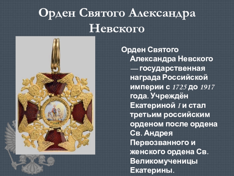 Российской империи с 1725 до 1917 года. Учреждён Екатериной I и стал третьим российским орденом после ордена Св. Андрея Первозванного и женского ордена Св. Великомученицы Екатерины.