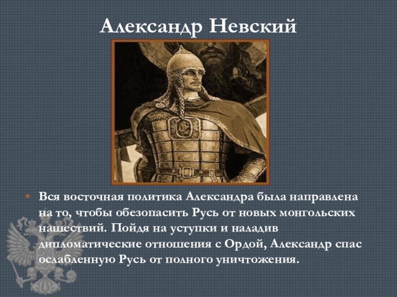 Русь от новых монгольских нашествий. Пойдя на уступки и наладив дипломатические отношения с Ордой, Александр спас ослабленную Русь от полного уничтожения.