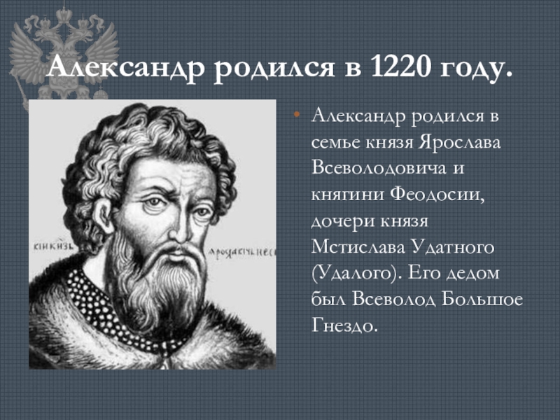 Всеволодовича и княгини Феодосии, дочери князя Мстислава Удатного (Удалого). Его дедом был Всеволод Большое Гнездо.