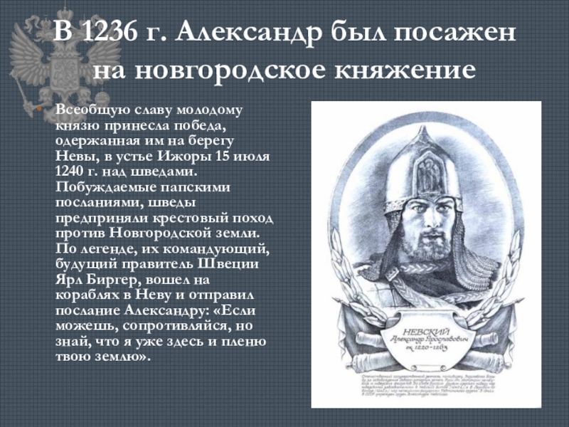 молодому князю принесла победа, одержанная им на берегу Невы, в устье Ижоры 15 июля 1240 г. над шведами. Побуждаемые папскими посланиями, шведы предприняли крестовый поход против Новгородской земли. По легенде, их командующий, будущий правитель Швеции Ярл Биргер, вошел на кораблях в Неву и отправил послание Александру: «Если можешь, сопротивляйся, но знай, что я уже здесь и пленю твою землю».