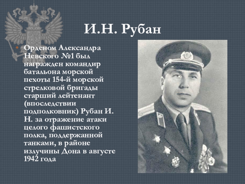 154-й морской стрелковой бригады старший лейтенант (впоследствии подполковник) Рубан И.Н. за отражение атаки целого фашистского полка, поддержанной танками, в районе излучины Дона в августе 1942 года