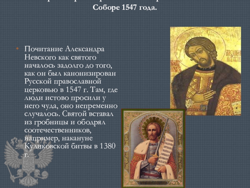 Почитание Александра Невского как святого началось задолго до того, как он был канонизирован Русской православной церковью в 1547 г. Там, где люди истово просили у него чуда, оно непременно случалось. Святой вставал из гробницы и ободрял соотечественников, например, накануне Куликовской битвы в 1380 г.