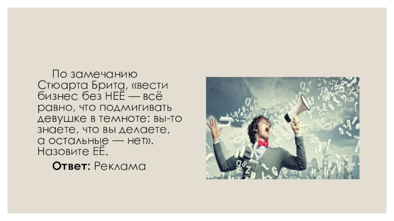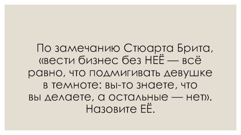 Слайд 7 По замечанию Стюарта Брита, «вести бизнес без НЕЁ — всё равно, что подмигивать