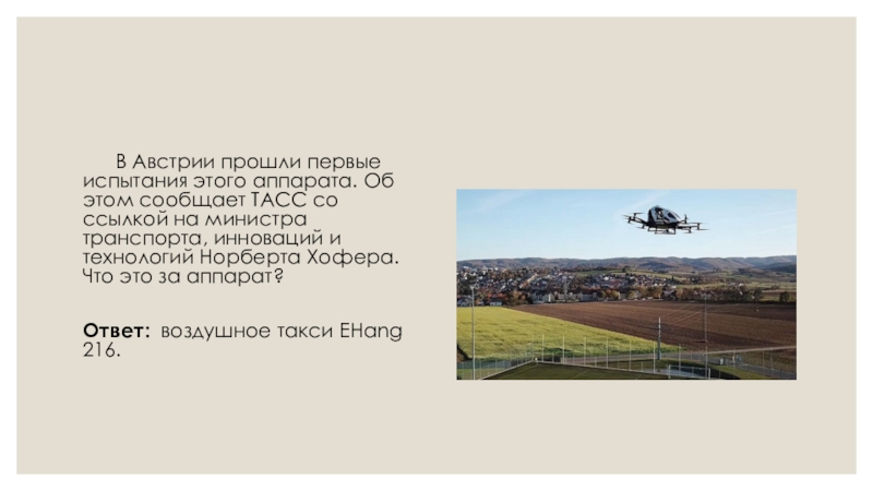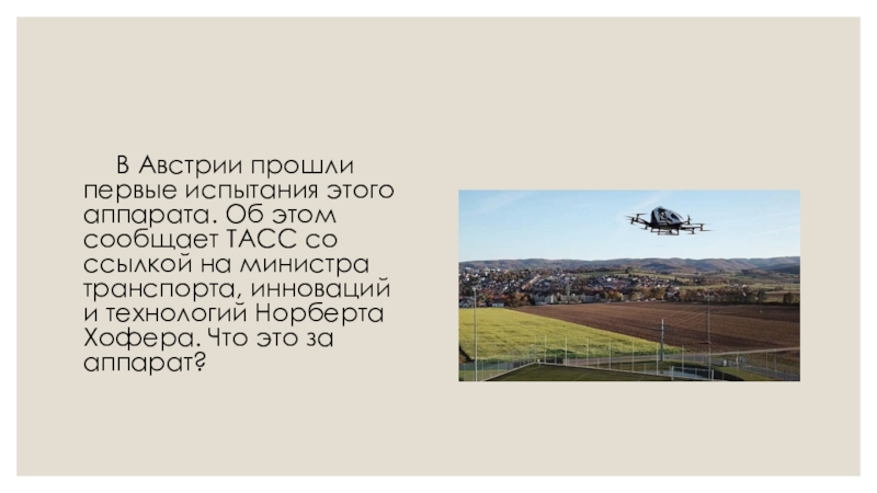 Слайд 19 В Австрии прошли первые испытания этого аппарата. Об этом сообщает ТАСС
