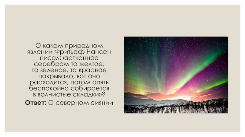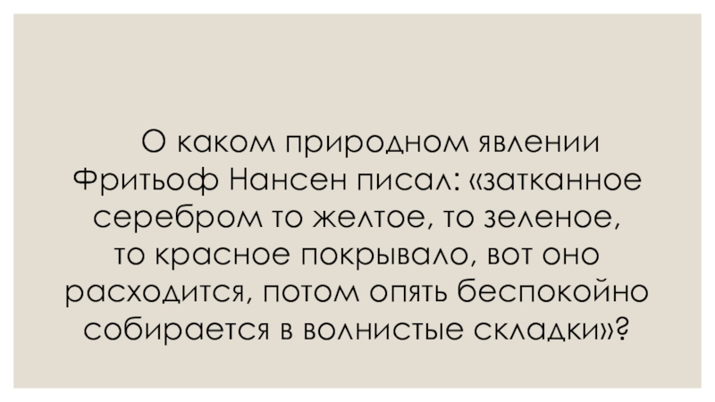 Слайд 10О каком природном явлении Фритьоф Нансен писал: «затканное серебром то желтое, то зеленое, то красное