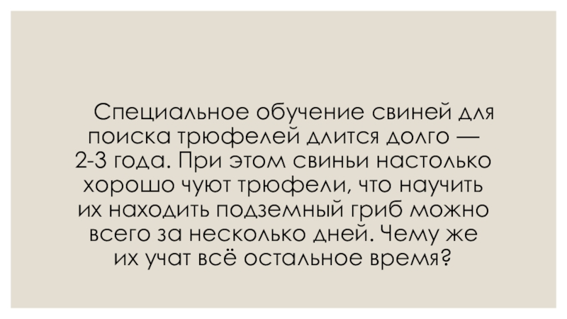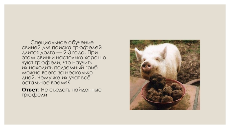 Слайд 13 Специальное обучение свиней для поиска трюфелей длится долго — 2-3 года. При этом
