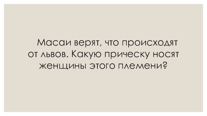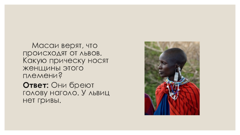 Слайд 4 Масаи верят, что происходят от львов. Какую прическу носят женщины этого племени?