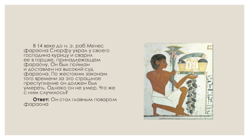 Слайд 16 В 14 веке до н. э. раб Менес фараона Снорфу украл у своего господина курицу и сварил
