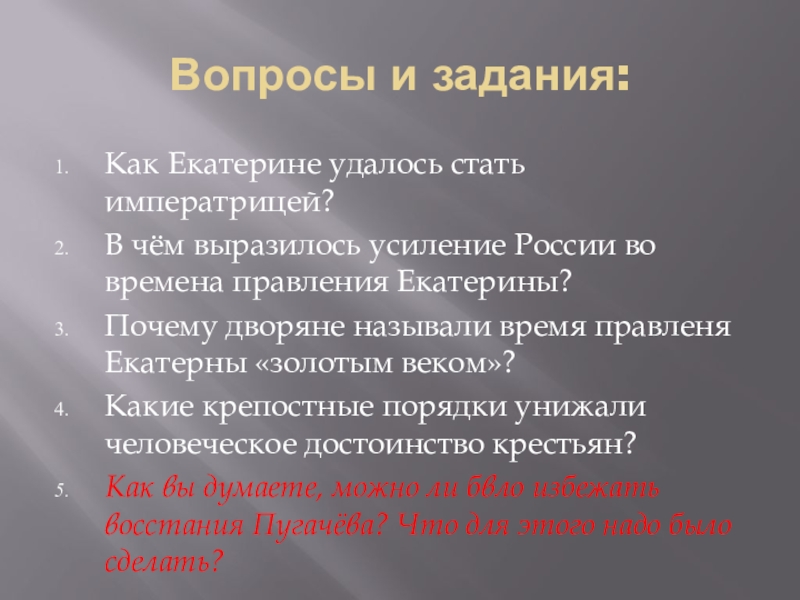 Вопросы и задания:Как Екатерине удалось стать императрицей?В чём выразилось усиление России во времена правления Екатерины?Почему дворяне называли