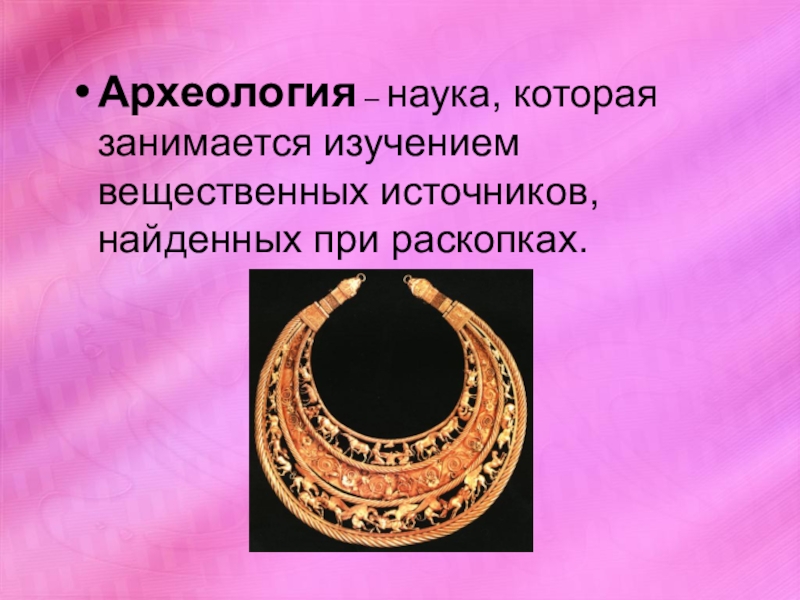 Археология – наука, которая занимается изучением вещественных источников, найденных при раскопках.
