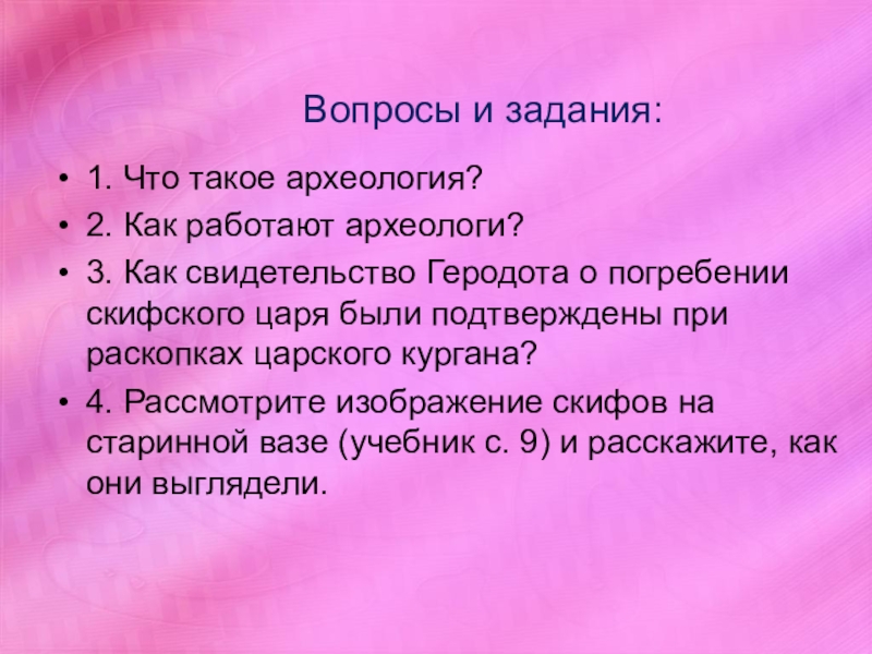 Вопросы и задания:1. Что такое археология?2. Как работают археологи?3. Как свидетельство Геродота о погребении скифского царя были