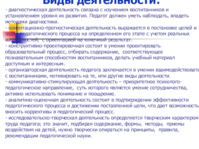 - диагностическая деятельность связана с изучением воспитанников и установлением уровня их развития. Педагог должен уметь наблюдать, владеть методами диагностики.