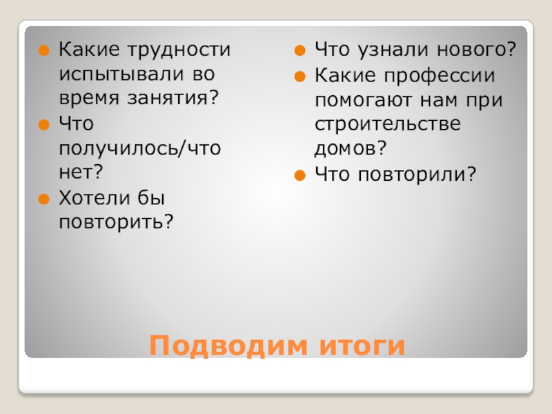 Подводим итогиКакие трудности испытывали во время занятия?Что получилось/что нет?Хотели бы повторить?Что узнали нового?Какие профессии помогают нам при