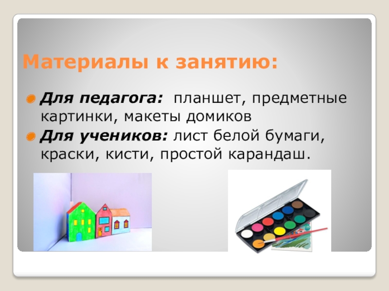 Материалы к занятию:Для педагога:  планшет, предметные картинки, макеты домиковДля учеников: лист белой бумаги, краски, кисти, простой карандаш.
