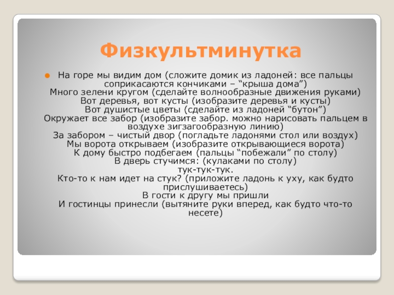 ФизкультминуткаНа горе мы видим дом (сложите домик из ладоней: все пальцы соприкасаются кончиками – “крыша дома”) Много