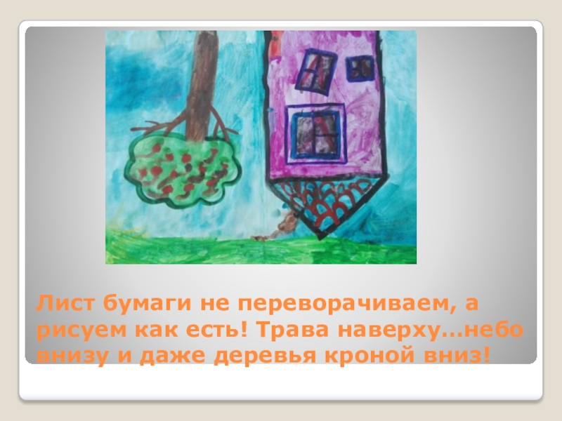Слайд 18Лист бумаги не переворачиваем, а рисуем как есть! Трава наверху…небо внизу