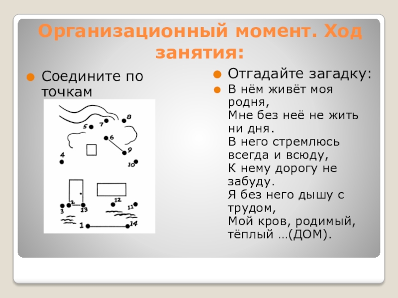 Организационный момент. Ход занятия:Соедините по точкамОтгадайте загадку:В нём живёт моя родня, Мне без неё не жить ни