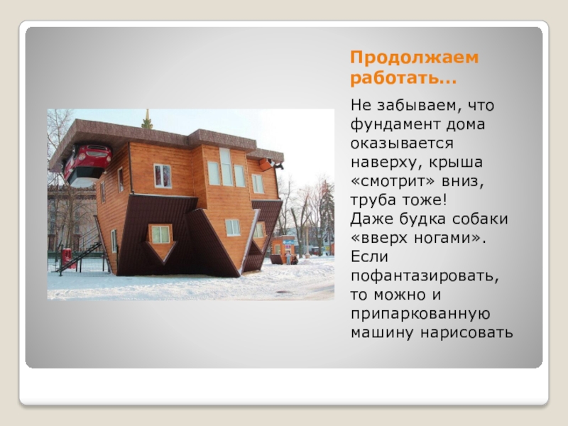 Продолжаем работать…Не забываем, что фундамент дома оказывается наверху, крыша «смотрит» вниз, труба тоже!Даже будка собаки «вверх ногами».