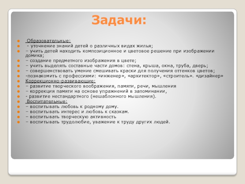 Задачи: Образовательные: - уточнение знаний детей о различных видах жилья;– учить детей находить композиционное и цветовое решение при изображении