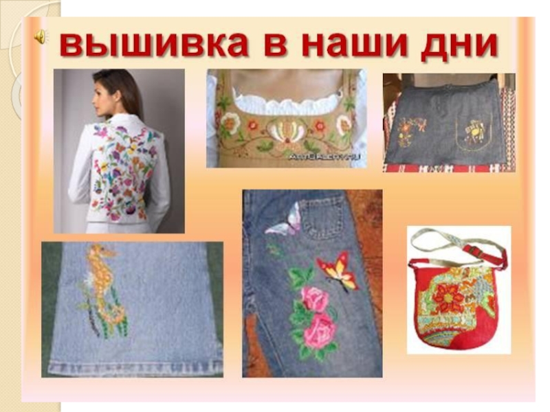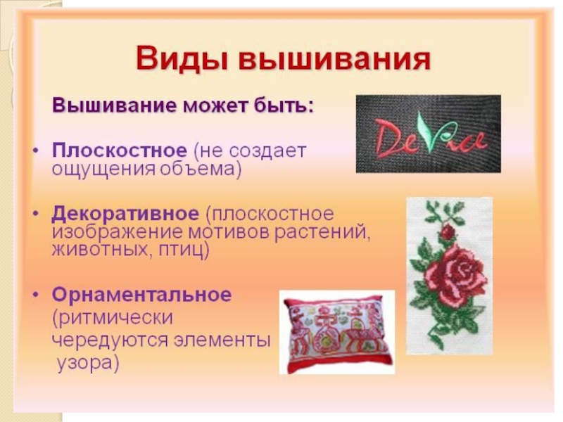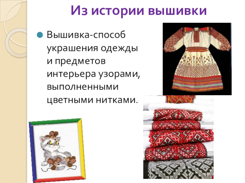 Вышивка-способ украшения одежды и предметов интерьера узорами, выполненными цветными