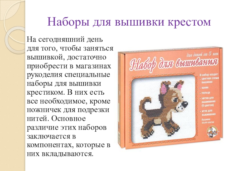 заняться вышивкой, достаточно приобрести в магазинах рукоделия специальные наборы для вышивки крестиком. В них есть все необходимое, кроме ножничек для подрезки нитей. Основное различие этих наборов заключается в компонентах, которые в них вкладываются.