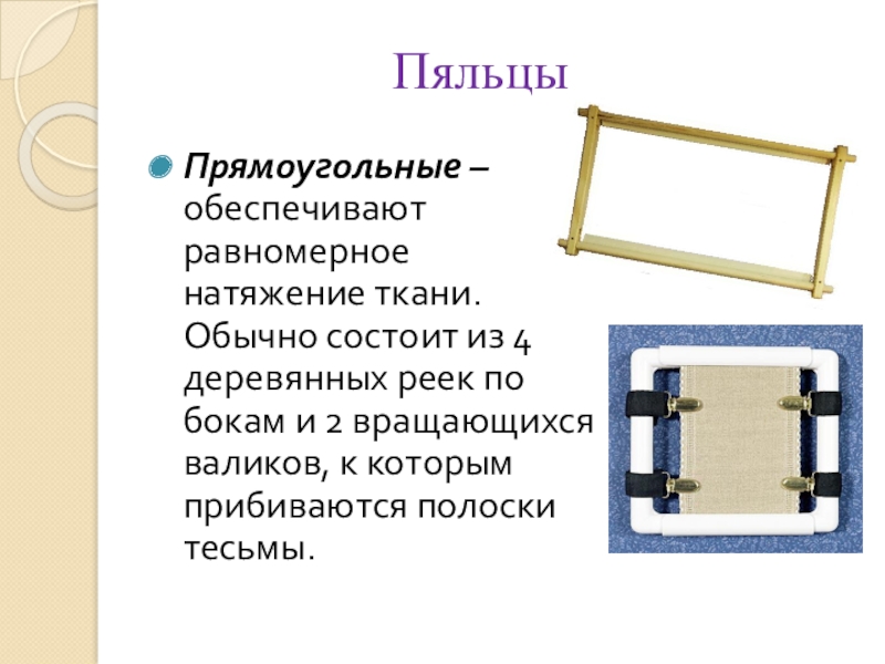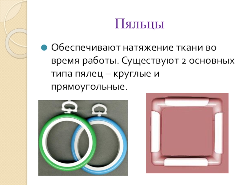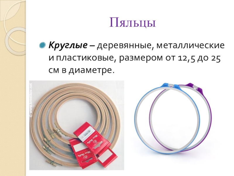 Обеспечивают натяжение ткани во время работы. Существуют 2 основных типа пялец