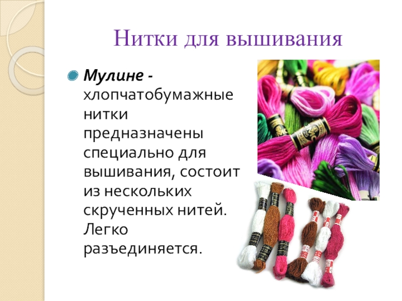 Мулине - хлопчатобумажные нитки предназначены специально для вышивания, состоит