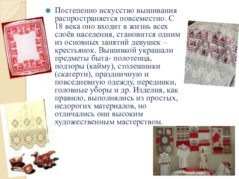 жизнь всех слоёв населения, становится одним из основных занятий девушек – крестьянок. Вышивкой украшали предметы быта- полотенца, подзоры (кайму), столешники (скатерти), праздничную и повседневную одежду, передники, головные уборы и др. Изделия, как правило, выполнялись из простых, недорогих материалов, но отличались они высоким художественным мастерством.