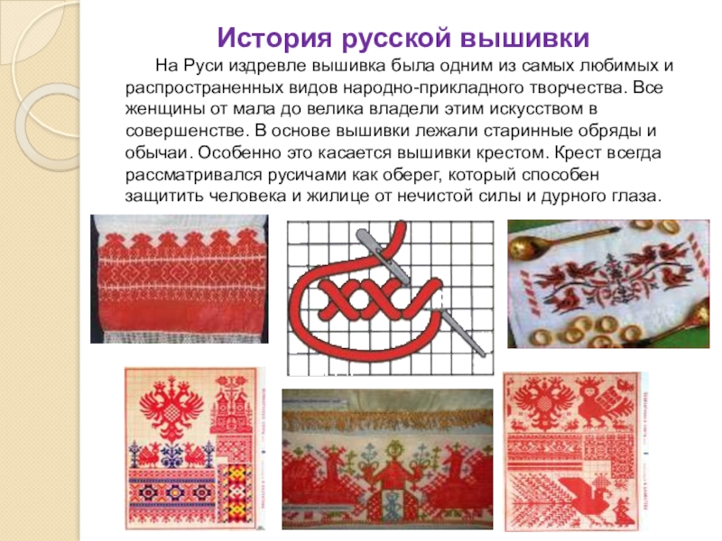 из самых любимых и распространенных видов народно-прикладного творчества. Все женщины от мала до велика владели этим искусством в совершенстве. В основе вышивки лежали старинные обряды и обычаи. Особенно это касается вышивки крестом. Крест всегда рассматривался русичами как оберег, который способен защитить человека и жилице от нечистой силы и дурного глаза.
