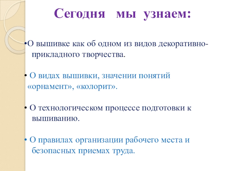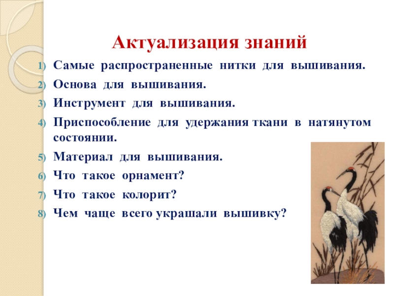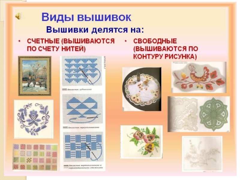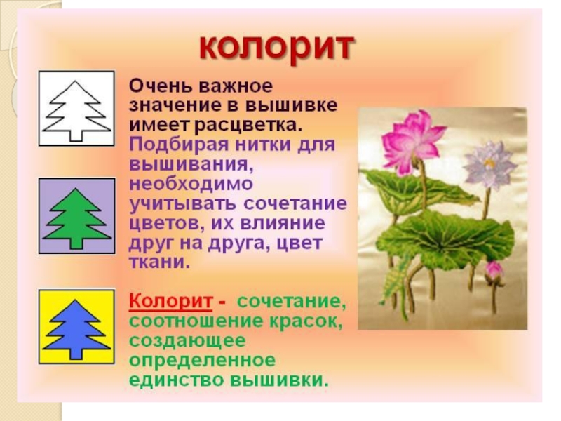 О видах вышивки, значении понятий «орнамент», «колорит».