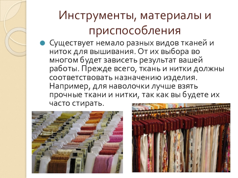 вышивания. От их выбора во многом будет зависеть результат вашей работы. Прежде всего, ткань и нитки должны соответствовать назначению изделия. Например, для наволочки лучше взять прочные ткани и нитки, так как вы будете их часто стирать.