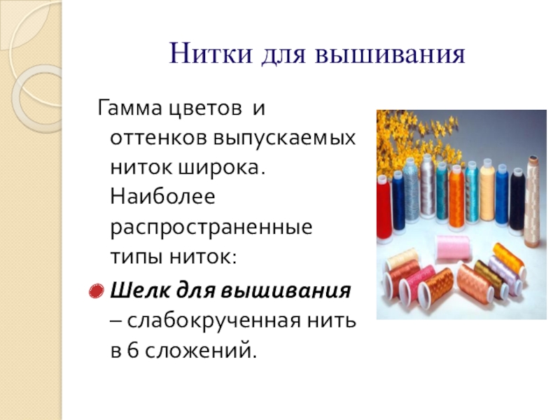 Шелк для вышивания – слабокрученная нить в 6 сложений.