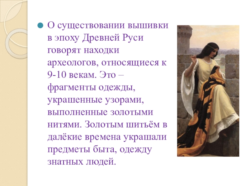 Слайд 5О существовании вышивки в эпоху Древней Руси говорят находки археологов, относящиеся
