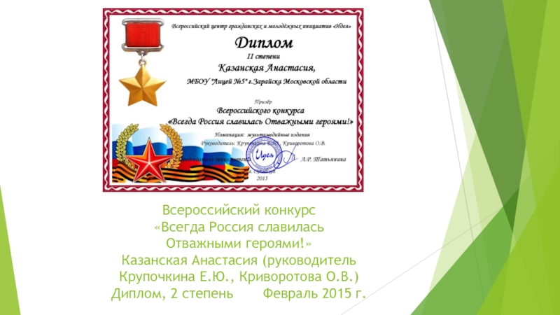 Слайд 7Всероссийский конкурс «Всегда Россия славилась Отважными героями!» Казанская Анастасия (руководитель Крупочкина Е.Ю.,