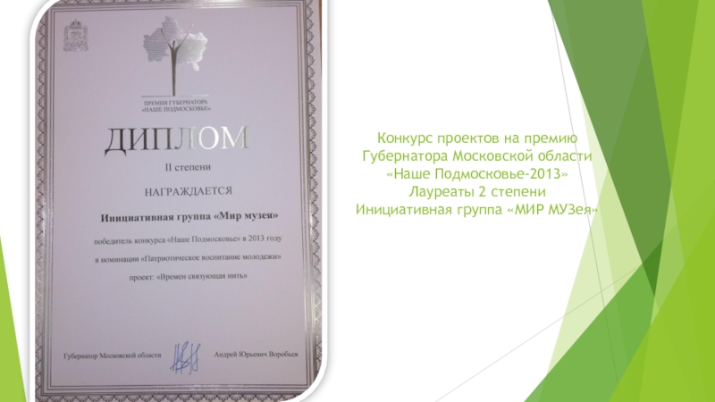Конкурс проектов на премию Губернатора Московской области  «Наше Подмосковье-2013» Лауреаты 2 степени Инициативная группа «МИР МУЗея»