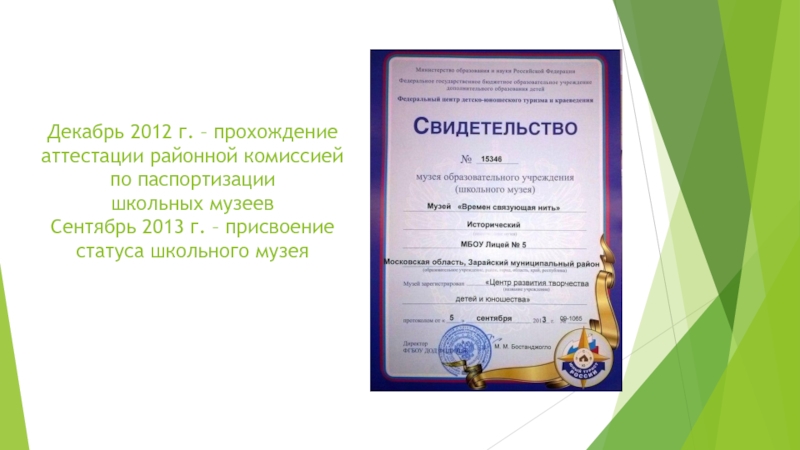 Декабрь 2012 г. – прохождение аттестации районной комиссией по паспортизации школьных музеев Сентябрь 2013 г. – присвоение статуса школьного музея