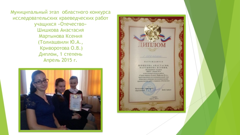 Слайд 8Муниципальный этап областного конкурса исследовательских краеведческих работ учащихся «Отечество» Шишкова Анастасия Мартынова Ксения