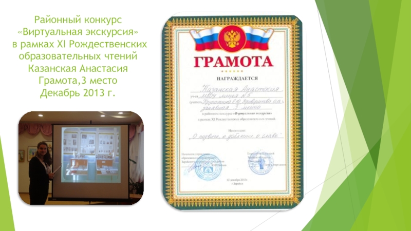 Районный конкурс «Виртуальная экскурсия»  в рамках XI Рождественских образовательных чтений Казанская Анастасия Грамота,3 место Декабрь 2013