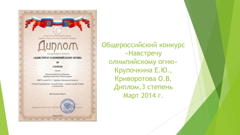 Слайд 5Общероссийский конкурс «Навстречу олимпийскому огню» Крупочкина Е.Ю., Криворотова О.В. Диплом,3 степень Март 2014 г.