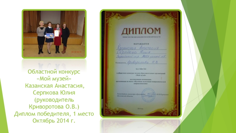 Слайд 6Областной конкурс «Мой музей» Казанская Анастасия, Серпкова Юлия (руководитель Криворотова О.В.) Диплом победителя,