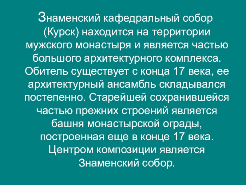 Слайд 11 Знаменский кафедральный собор (Курск) находится на территории мужского монастыря и