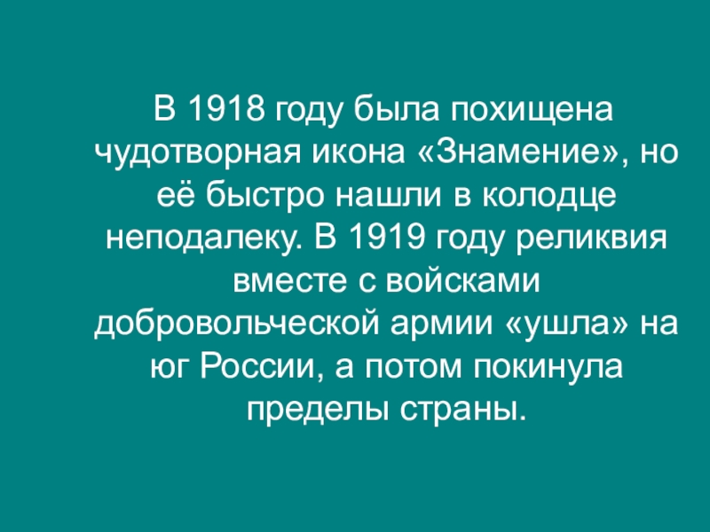 В 1918 году была похищена чудотворная икона «Знамение», но