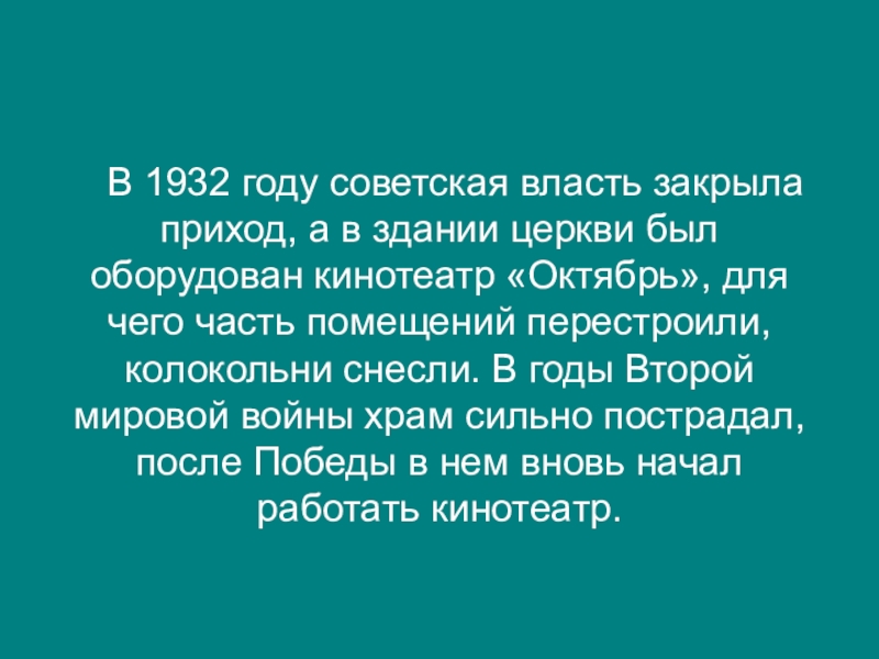 В 1932 году советская власть закрыла приход, а в здании церкви был оборудован кинотеатр «Октябрь»,
