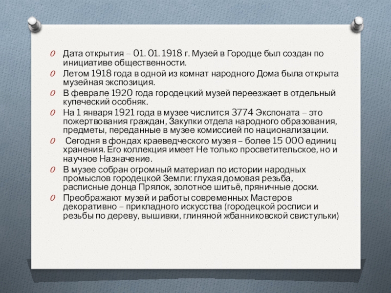 Слайд 22Дата открытия – 01. 01. 1918 г. Музей в Городце был
