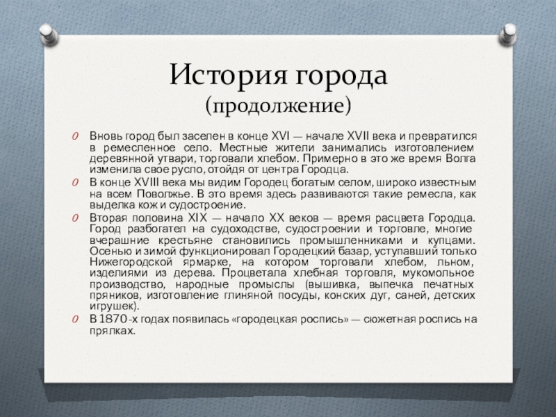 XVII века и превратился в ремесленное село. Местные жители занимались изготовлением деревянной утвари, торговали хлебом. Примерно в это же время Волга изменила свое русло, отойдя от центра Городца.