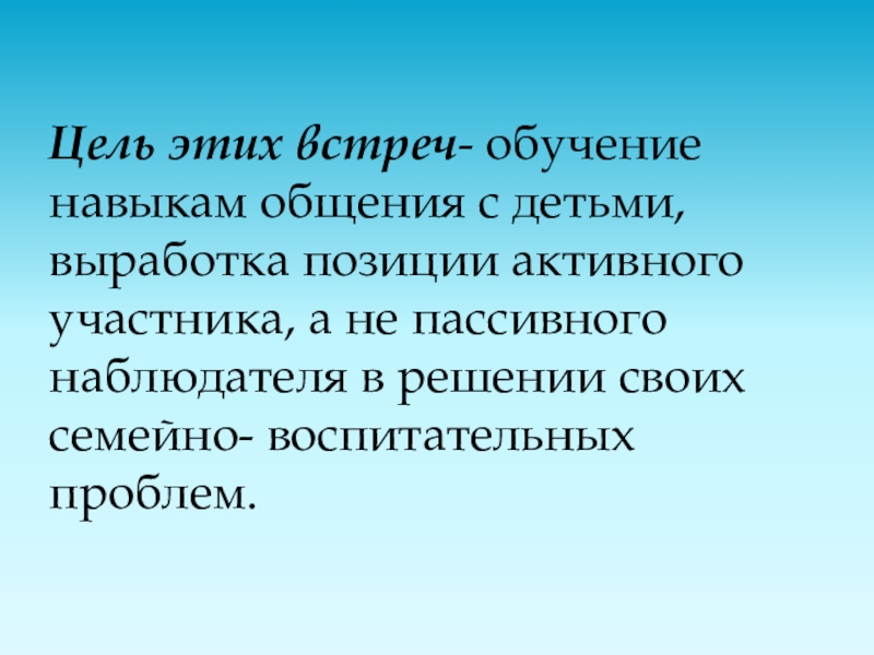 Цель этих встреч- обучение навыкам общения с детьми, выработка позиции активного участника, а не пассивного наблюдателя