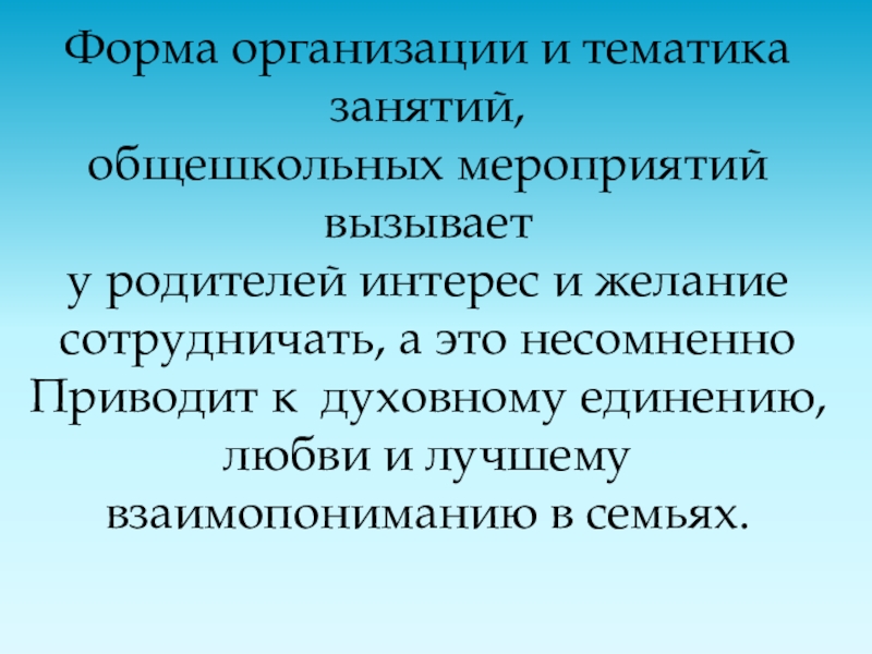 Форма организации и тематика занятий,общешкольных мероприятий вызываету родителей интерес и желание сотрудничать, а это несомненно Приводит