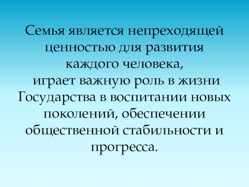 Семья является непреходящей ценностью для развития каждого человека, играет важную роль в жизни Государства в воспитании