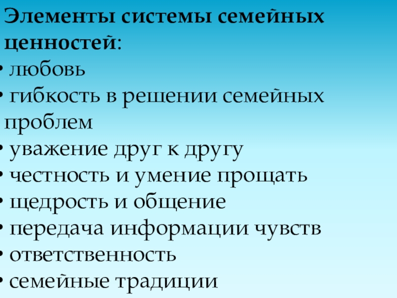 Элементы системы семейных ценностей: любовь  гибкость в решении семейных проблем уважение друг к другу честность