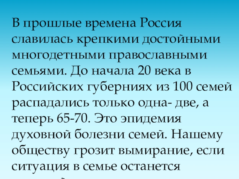 До начала 20 века в Российских губерниях из 100 семей распадались только одна- две, а теперь 65-70. Это эпидемия духовной болезни семей. Нашему обществу грозит вымирание, если ситуация в семье останется прежней.